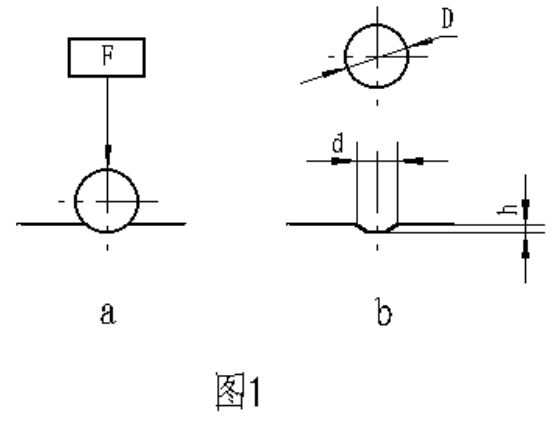 金屬布氏硬度試驗(yàn)系采用一定直徑硬質(zhì)合金球,以規(guī)定試驗(yàn)力壓入被測材料表面(圖1a)按規(guī)定保持時間后,卸除試驗(yàn)力,(圖1b)測量試樣表面的壓痕直徑,以計算出布氏硬度,并以下式計算之: