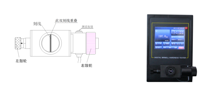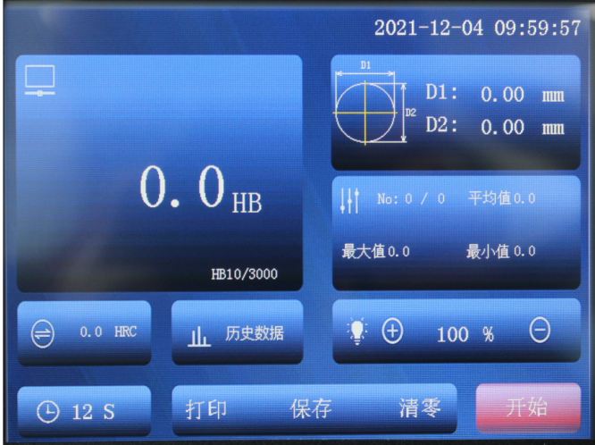 本機試驗過程LCD觸摸屏顯示,壓痕可在儀器上通過測微目鏡直接測量,并能在LCD觸摸屏顯示屏顯示壓痕的直徑,砝碼加力。