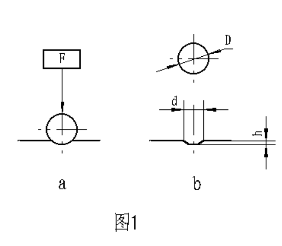 金屬布氏硬度試驗系采用一定直徑硬質(zhì)合金球,以規(guī)定試驗力壓入被測材料表面(圖1a)按規(guī)定保持時間后,卸除試驗力,(圖1b)測量試樣表面的壓痕直徑,以計算出布氏硬度,并以下式計算之: